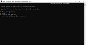 A console line based guessing game made by a small developer who is in high school and made all the assets from scratch. There are 2 versions of Guess The Number (GTN Menu and GTN without Menu).